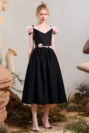 Three-dimensional rose dress banquet summer light mature celebrity temperament elegant black waist dress