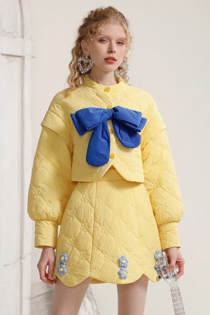 Cute age reducing yellow cotton suit autumn and winter sweet bow top three-dimensional floret a-line skirt