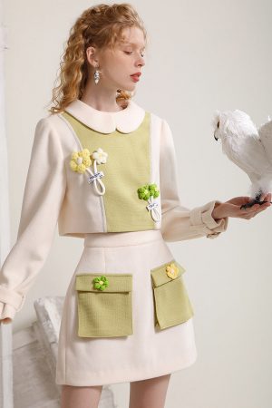 Foreign three-dimensional floral suit skirt women’s age reduction doll collar contrast top pocket design A-line skirt