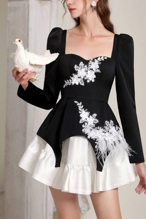 French Elegant Dress, Unique Feather Decal, Contrast Color, Slim Waist, Square Neck, Poncho Dress