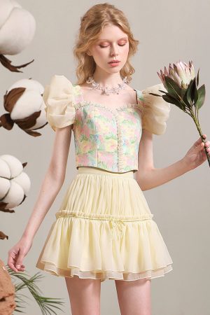 23 Year Age Reducing Set Skirt Fresh Print Short Folding Sleeve Top High Waist Slim Half Skirt Two Piece Set