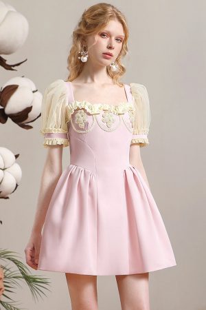 2023 New Age Reducing Contrast Color Dress Fashion 3D Flower Doll Neck Waist Wrapped Bubble Sleeve Skirt