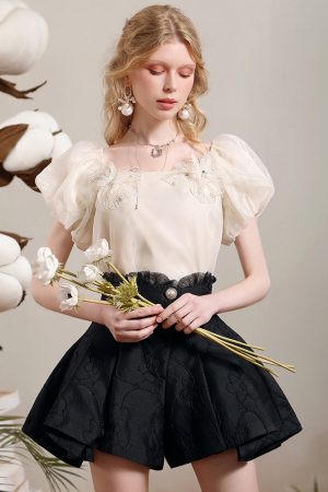 Age-reducing pink blouse female 23-year-old summer sweet design bow jacquard fabric bubble sleeve shirt