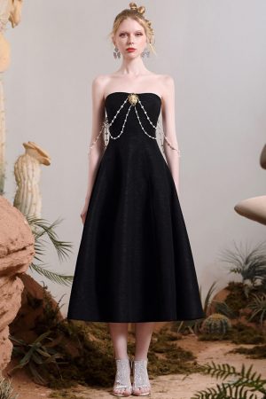 French Hepburn style dress, celebrity fan, elegant temperament, bead chain, sexy tube top, black dress.