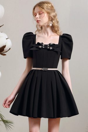 French Hepburn style small black dress with feminine temperament, elegant embroidery, waistband, slim bubble sleeve dress, small figure