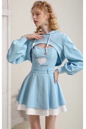 Sweet Blue Sweater Set Skirt Lantern Sleeves Drawstring Hooded Hoodie Sweetheart Love A-Swing Sling Dress