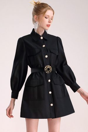 Simple black dress 23 years temperament commuting single breasted polo collar waist waist show thin lantern sleeve skirt