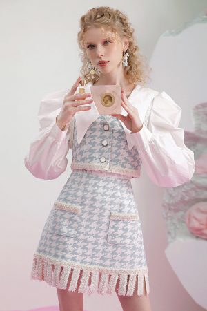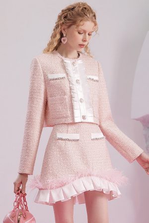 Small fragrant pink suit skirt celebrity fan tweed crewneck top high-waist design sense feather skirt