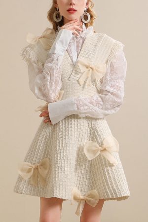 Sweet Bowknot Dress Women’s Autumn Temperament Fringe Edge Waist Slim Coarse Woolen Vest Dress