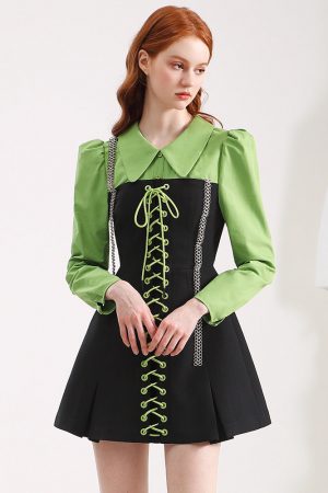 Retro contrast color skirt Women’s chain lace-up temperament Elegant polo neck waist show thin bubble sleeve dress