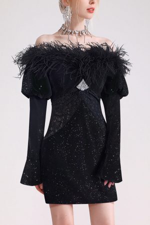 Temperament dress dress banquet elegant celebrity sexy off-the-shoulder spiked feathers slim black velvet hip skirt