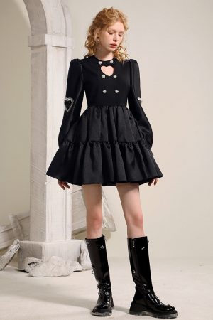 Sweet Cool Style Small Black Dress Women’s Autumn Retro Love Hollow out Lantern Sleeves Air Quality Waist Closing Dress