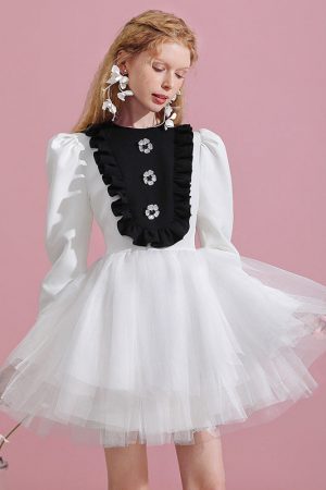 White dress dress women’s new gentle style black and white contrast mesh stitching design short dress