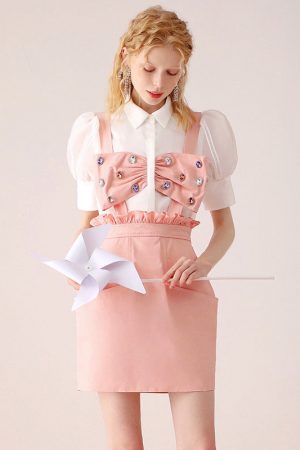 Sweet cool pink suit skirt design sense butterfly cutout stud diamond top high waist slimming skirt two-piece