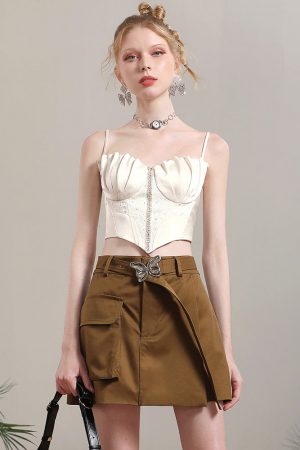 Sweet and Cool Design Sense Slim Strap Summer Outwear Personalized Fashion Sexy Slim Fit Short Tank Top with Chest Cushion Apricot Color