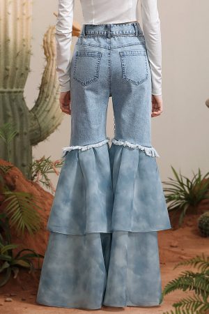 [Millennium New Era] Jeans women's design sense is slim, organza printed and spliced bell bottoms.