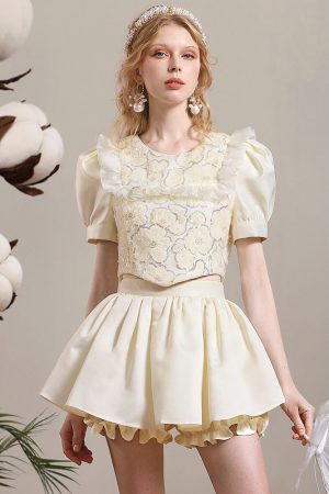 [Sleeping Dreams] Set of Dress Temperament, Three Dimensional Flower Bead Piece Top, High Waist, Fluffy Trouser Skirt, Two Piece Set